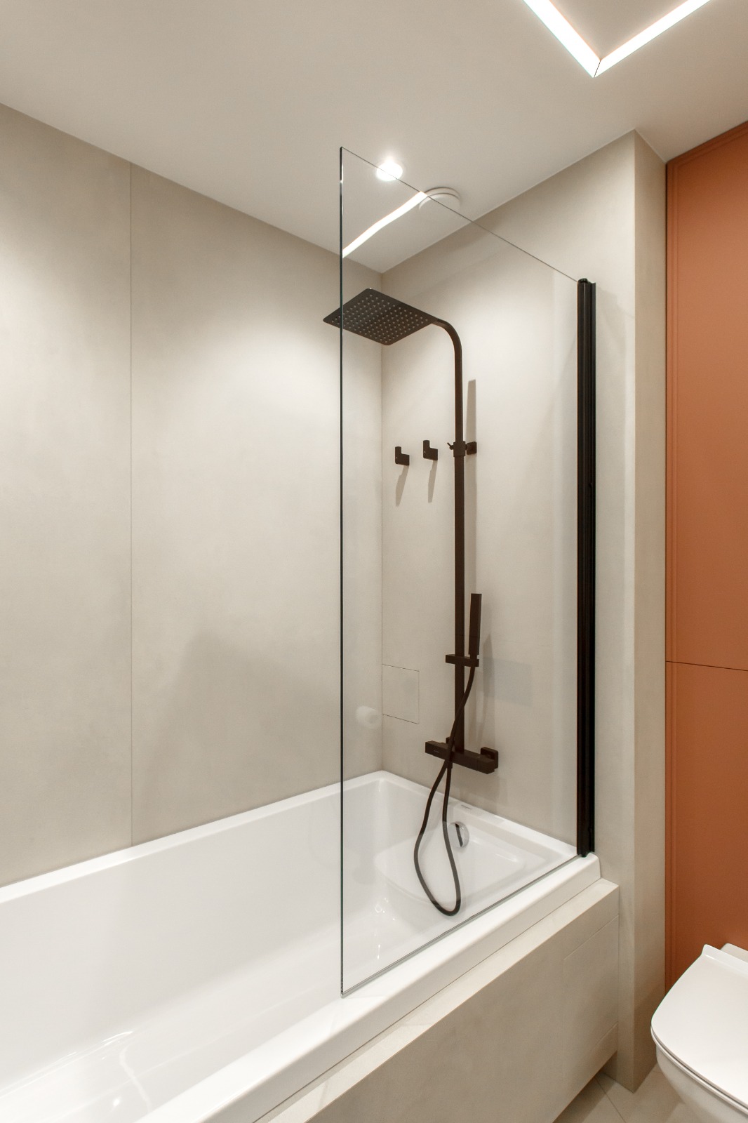 Соединить классическую ванну и удобную душевую кабинку в одной конструкции - отличное решение для небольших ванных комнат, где установка двух отдельных элементов невозможна. Как сделать так, чтобы и лежать в ванной, и принять быстрый легкий душ было одинаково комфортно? На помощь придут специальные стеклянные перегородки.